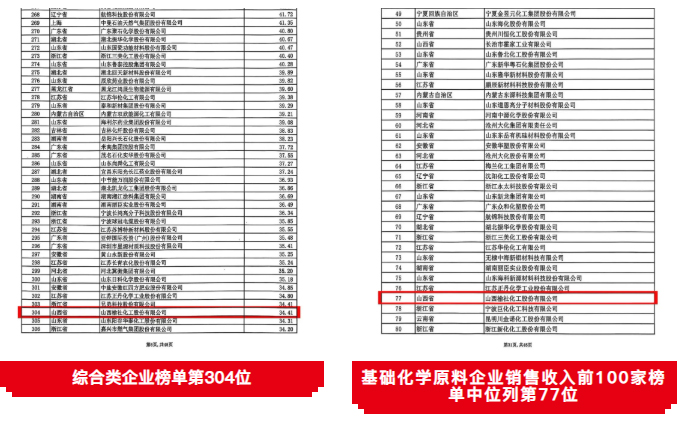 10月23日,2025石油和化工企业销售收入500强发布会暨“数智新引擎 引领新征程”交流会在江西吉安召开。会上,2025中国石油和化工企业销售收入前500家及分行业百家榜单正式揭晓,公司位列综合类企业榜单第304位;在基础化学原料企业销售收入前100家榜单中位列第77位。